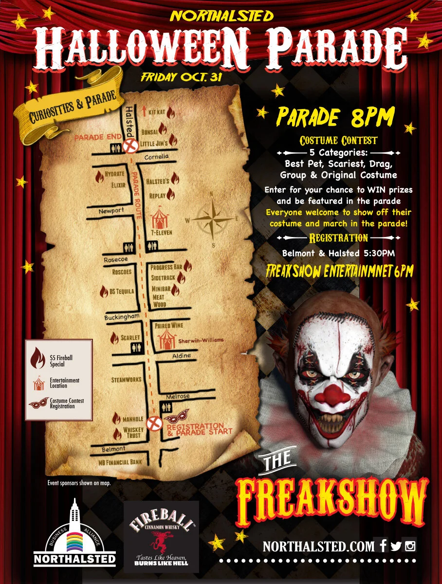 → Boystown Halloween Signage: For 3 years in a row I was invited and worked with the Northalsted Business Association to create street banner signage and collateral for the Annual Northalsted Halloween celebration. Below are several examples. The title/theme was chosen for me and I concepted the art directional approach for each. These large banners hung on all the street lamps throughout the neighborhood.